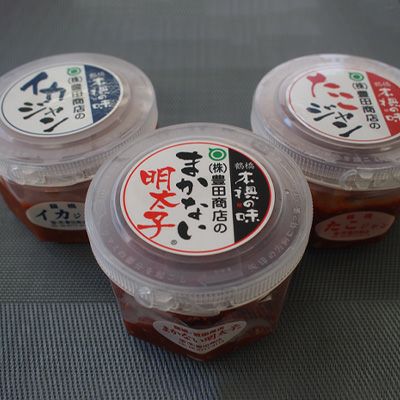 豊田商店自慢の美味しい珍味のお試しセット。こりこり食感が人気の「肉厚チャンジャ」・噛んだ瞬間じわっと旨みが溢れる「スルメ味付」・メンタイ(タラ)を甘辛く味付けした「メンタイ味付」の3点セットです。